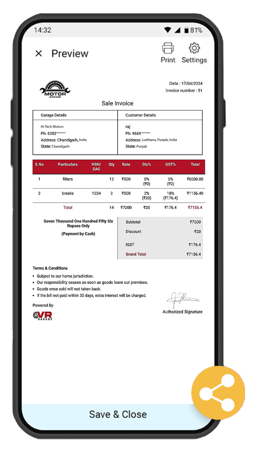 Offer discounts to suit your needs, and accept payments seamlessly through UPI, cash, net banking, or credit/debit cards. VR Garage streamlines your sales process, saving you time and effort.